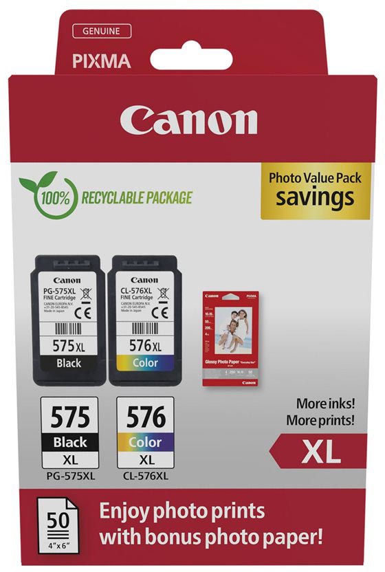 Canon photo value pack 1 x PG-575XL + 1 x CL-576XL, 300 - 400 pagina's, OEM 5437C006, 4 kleuren heeft nog geen reviews. Deel uw product ervaring en plaats een review.