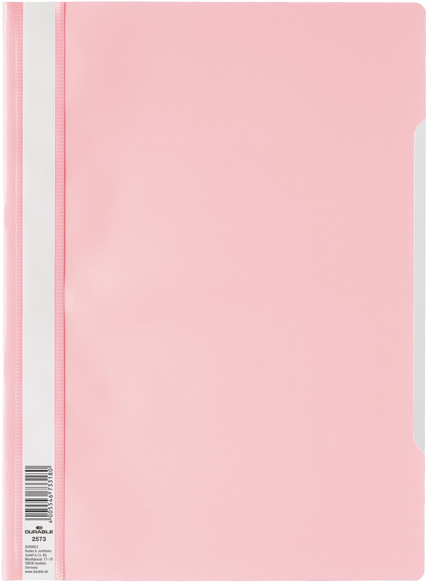 Map van standaard kwaliteit met doorzichtige voorzijde. Zichtsnelhechtmappen van DURABLE zijn ontworpen voor uiteenlopende toepassingen, zoals rapporten, offertes, notities en opslag van documenten. Ruime kleurkeuze en etiketteringsmogelijkheden. Kan worden uitgerust met een ordnerhechter (art.nr. 2996), om op te bergen in ringmappen. Specificaties: Voor ft A4 Uit PP Met transparant voorblad en etiketvenster over de gehele lengte Uitsnijding in de voorzijde om gemakkelijk te kunnen bladeren 100 %recycleerbaar