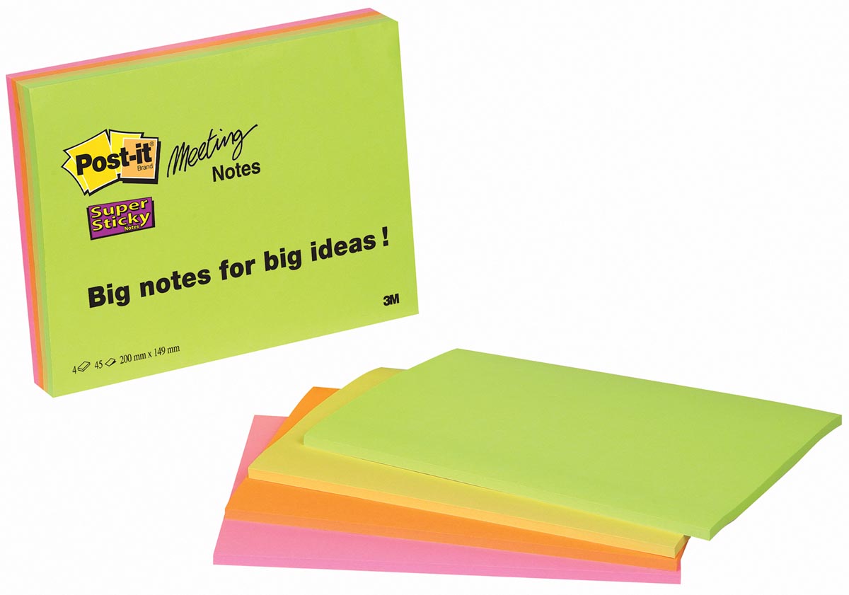 Post-it Super Sticky Meeting notes, 45 vel, ft 152 x 203 mm, geassorteerde kleuren, pak van 4 blokken